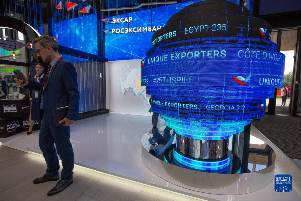 这是6月15日在俄罗斯圣彼得堡拍摄的第25届圣彼得堡国际经济论坛展台。