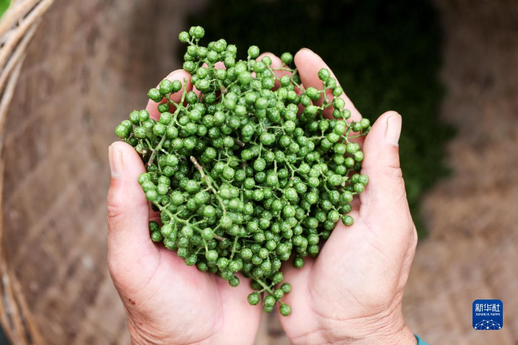 6月16日,村民在贵州省务川仡佬族苗族自治县镇南镇同德社区花椒基地展示采收到的花椒。