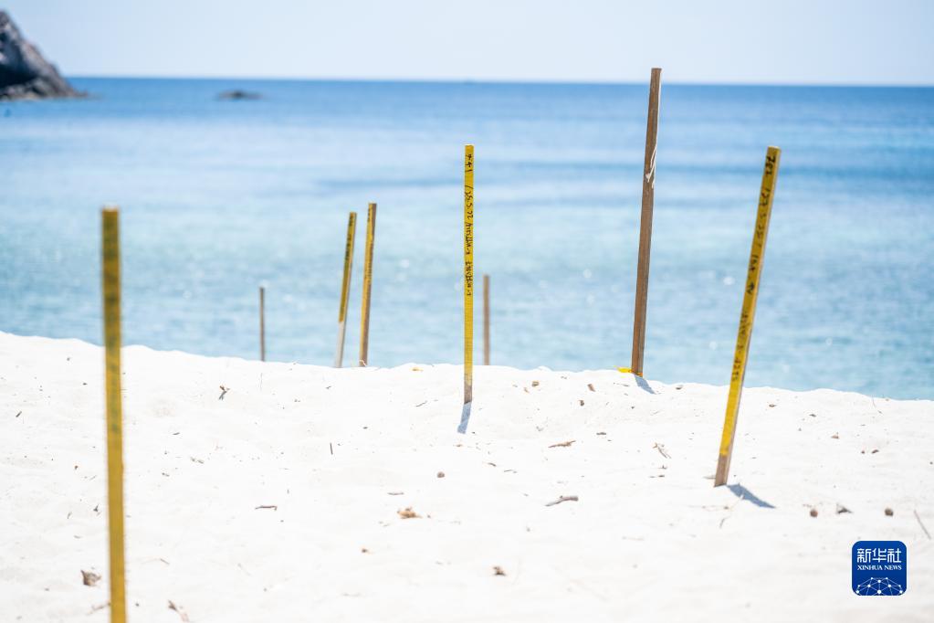 这是6月14日拍摄的马来西亚丁加奴州热浪岛北部査加尔瑚棠海龟保护区海滩。每一根木棍代表一处海龟筑巢点。