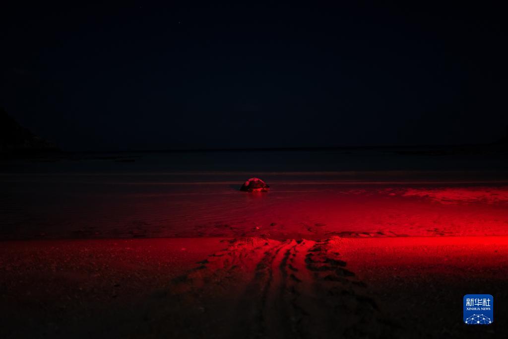 6月14日,在马来西亚丁加奴州热浪岛北部査加尔瑚棠海龟保护区,一只绿海龟产卵后回归大海。
