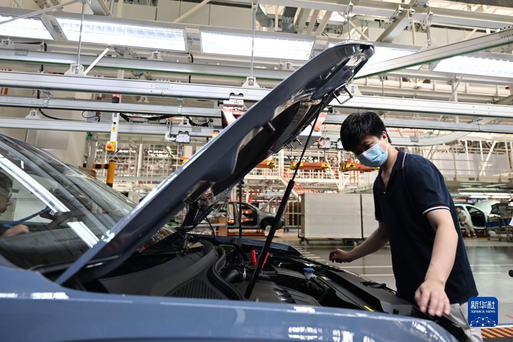 工人在天津经济技术开发区一汽-大众华北基地总装车间内装配车辆(6月15日摄)。