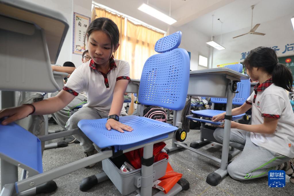 6月16日,浙江省湖州市德清县雷甸镇中心小学通航校区学生在调整可折叠课桌椅。