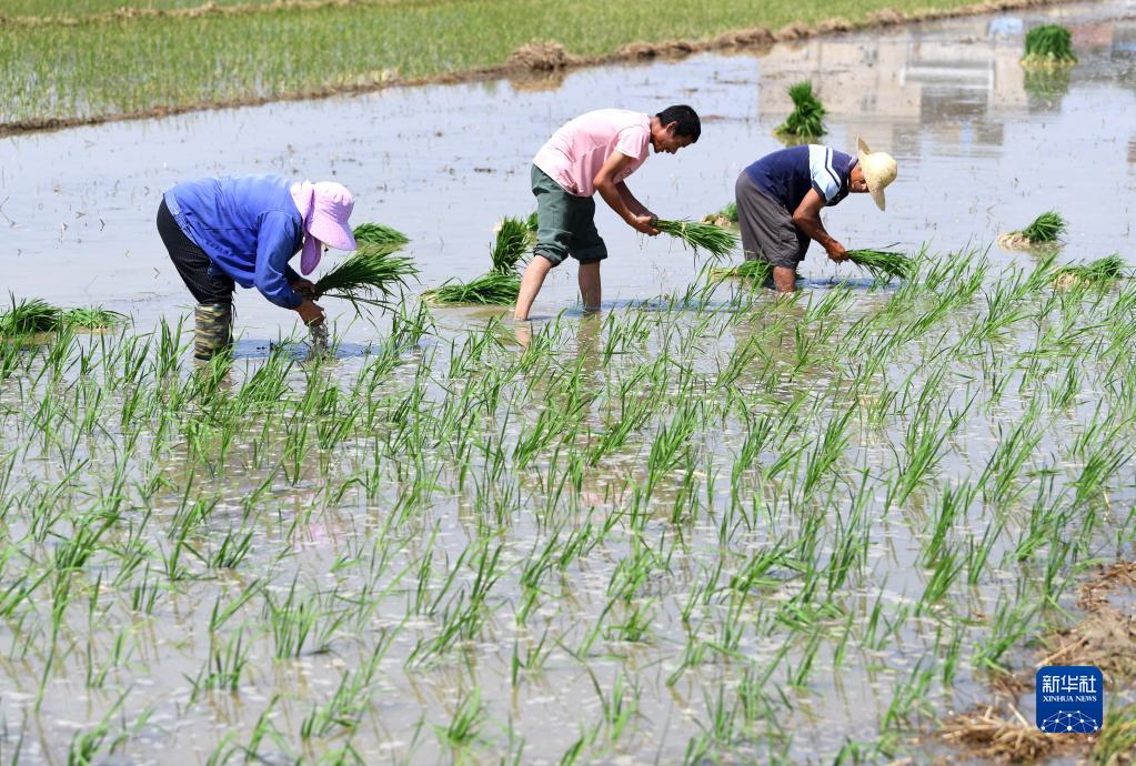 6月17日,五河县新集镇农民在田间插秧。