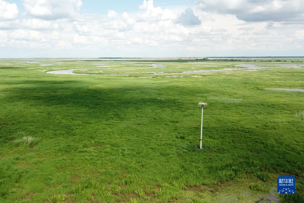6月16日拍摄的国网齐齐哈尔供电公司在黑龙江乌裕尔河国家级自然保护区内修建的一个人工鸟巢,巢内有东方白鹳幼鸟(无人机照片)。