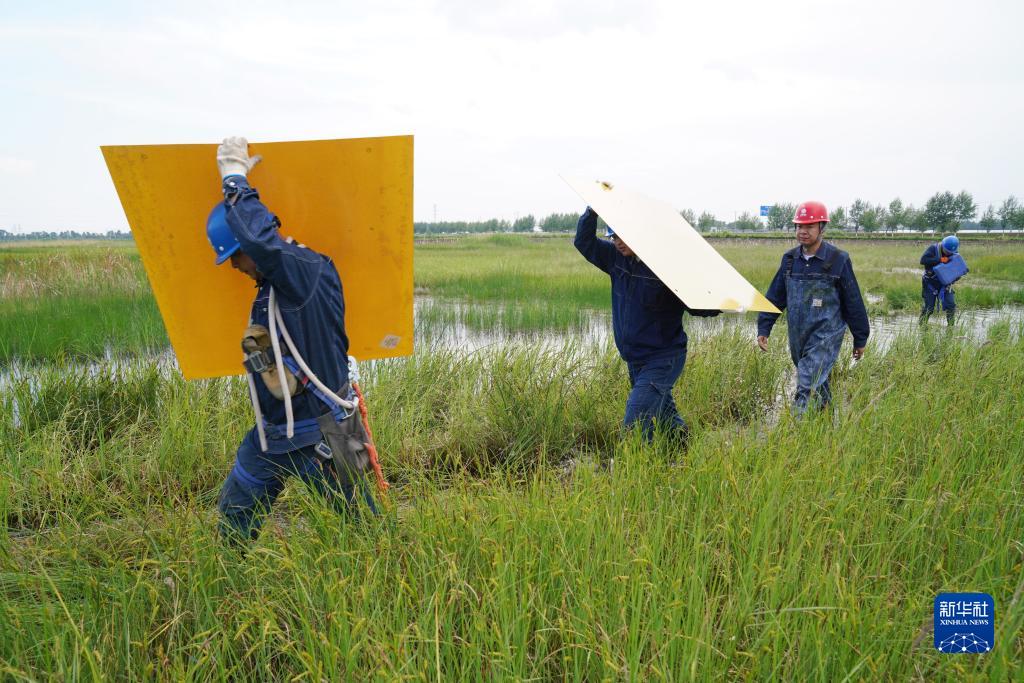 6月15日,电力工人携带装备路过一块稻田,准备给齐齐哈尔市昂昂溪区一输电铁塔安装护鸟板。