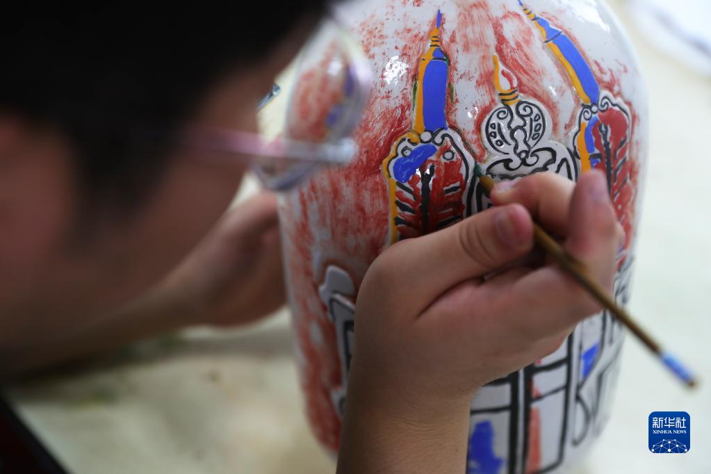 6月16日,在抚顺大官窑陶瓷工作室,一位学生体验陶瓷绘画。