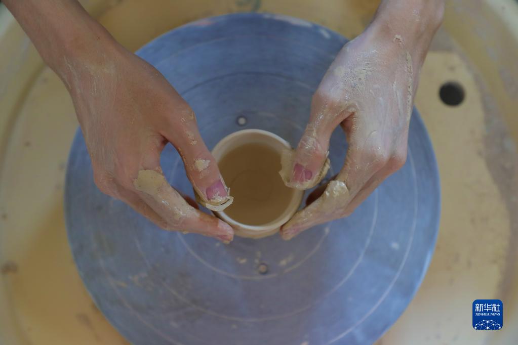 6月16日,在抚顺大官窑陶瓷工作室,一位学生体验陶瓷泥胚制作。