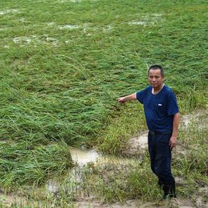 6月17日,在江西省龙南市桃江乡洒口村,村民介绍水稻的受灾情况。