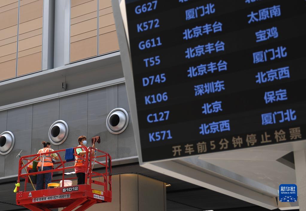 6月17日,施工人员在北京丰台站候车大厅进行收尾工作。