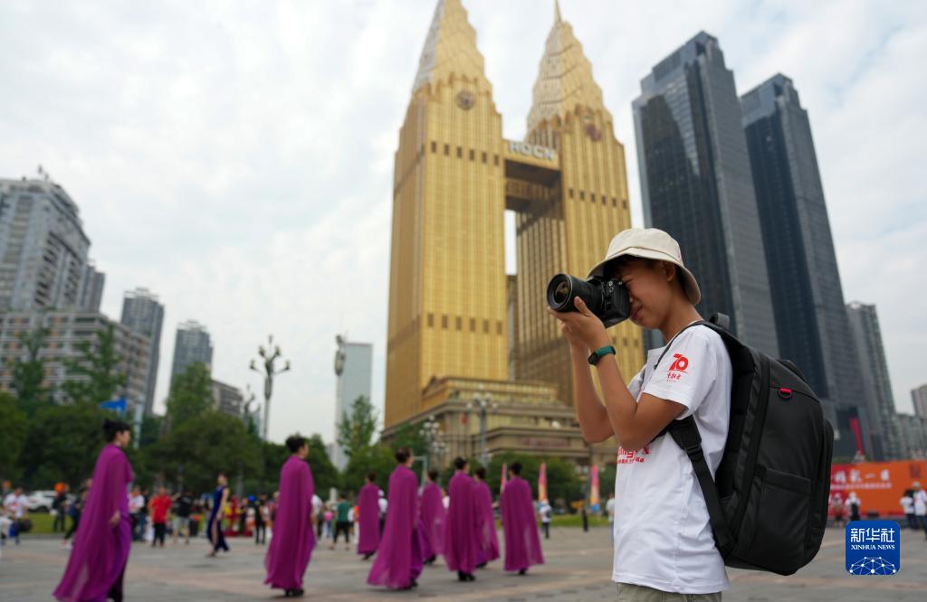 6月18日,在重庆市南岸区南滨路烟雨公园内,一名参加重庆市青少年拍重庆活动的小学生用相机拍摄城市生活的画面。