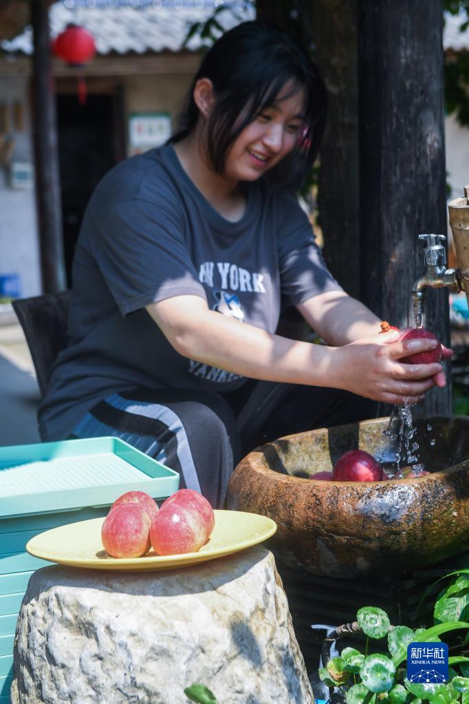 6月18日,游客在道场乡道场浜村的桃园里清洗刚采摘的庚村阳桃。