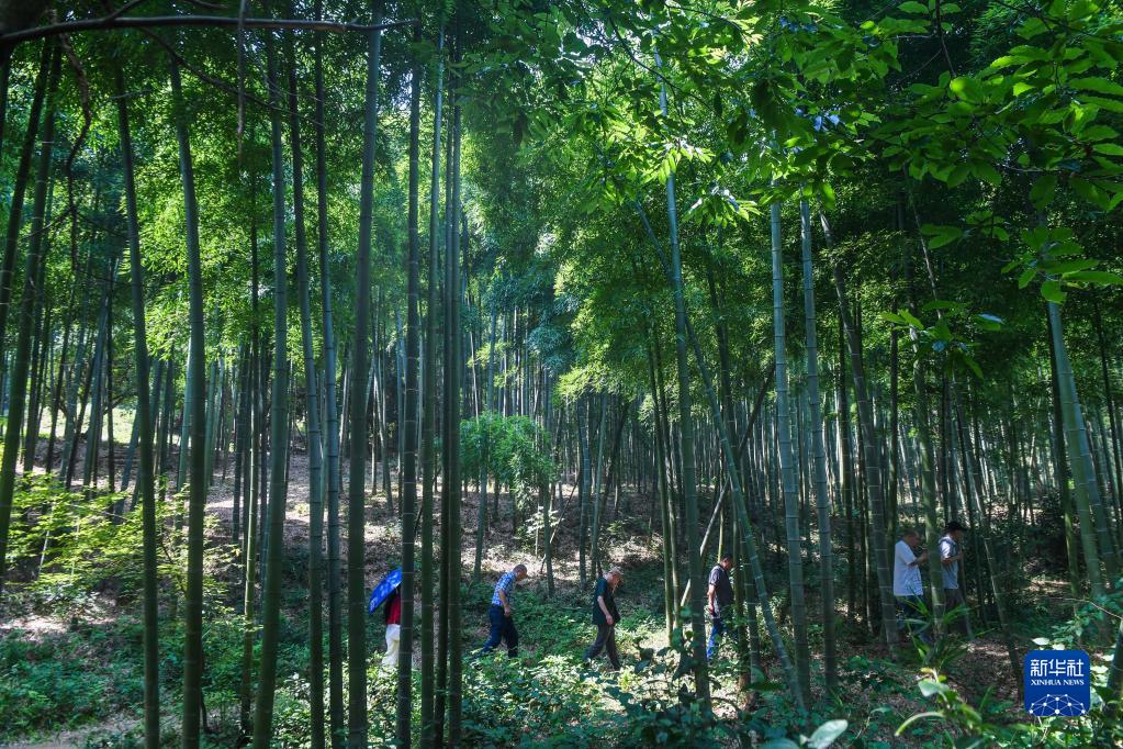 6月18日,游客在道场乡道场浜村的竹林中感受乡村美景。