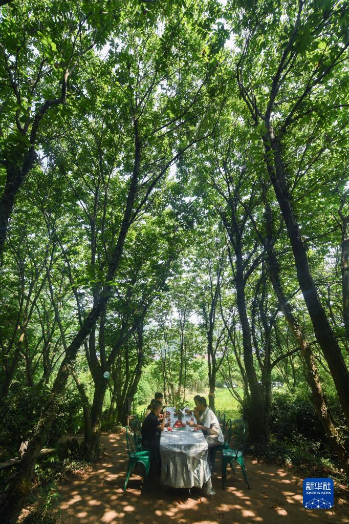 6月18日,游客在道场乡道场浜村树林中感受清凉、品尝鲜桃。