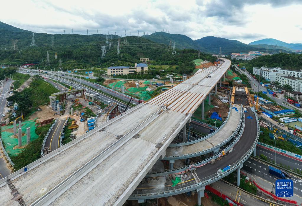 工人在深圳东部过境高速简龙立交桥进行铺架作业(6月17日摄,无人机照片)。