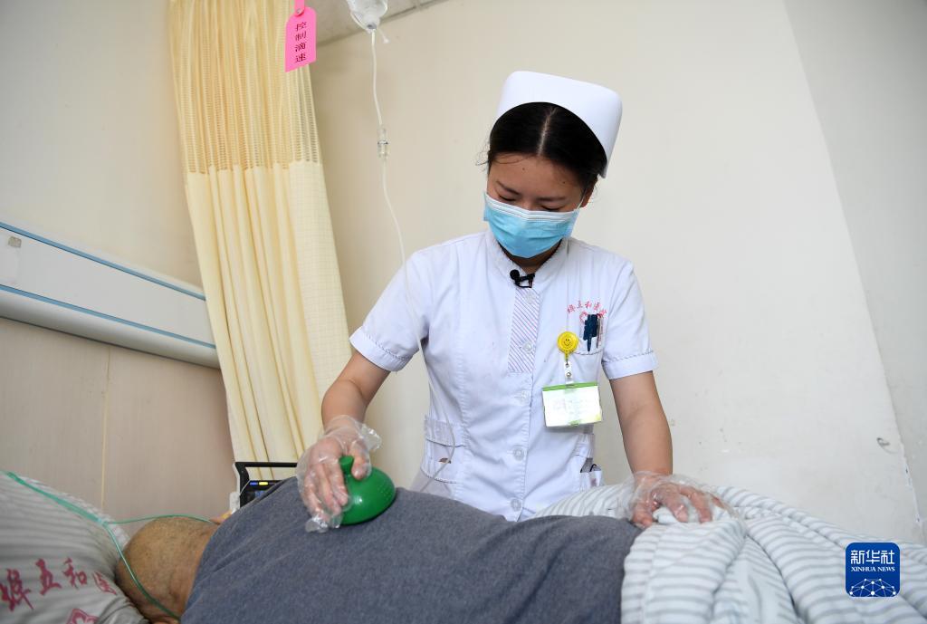 6月16日,黄凤在蚌埠五和医院病房为病人做护理。新华社记者朱青摄