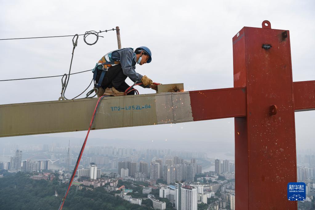 6月17日,工人在重庆陆海国际中心项目主塔楼施工作业。