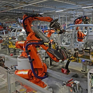2月16日,在华晨宝马沈阳铁西工厂车身车间,机器臂在焊接车身。