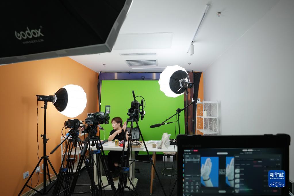 6月18日,在北京市东城区红桥市场的红桥电商直播基地内,工作人员在网络直播间推介珍珠饰品。