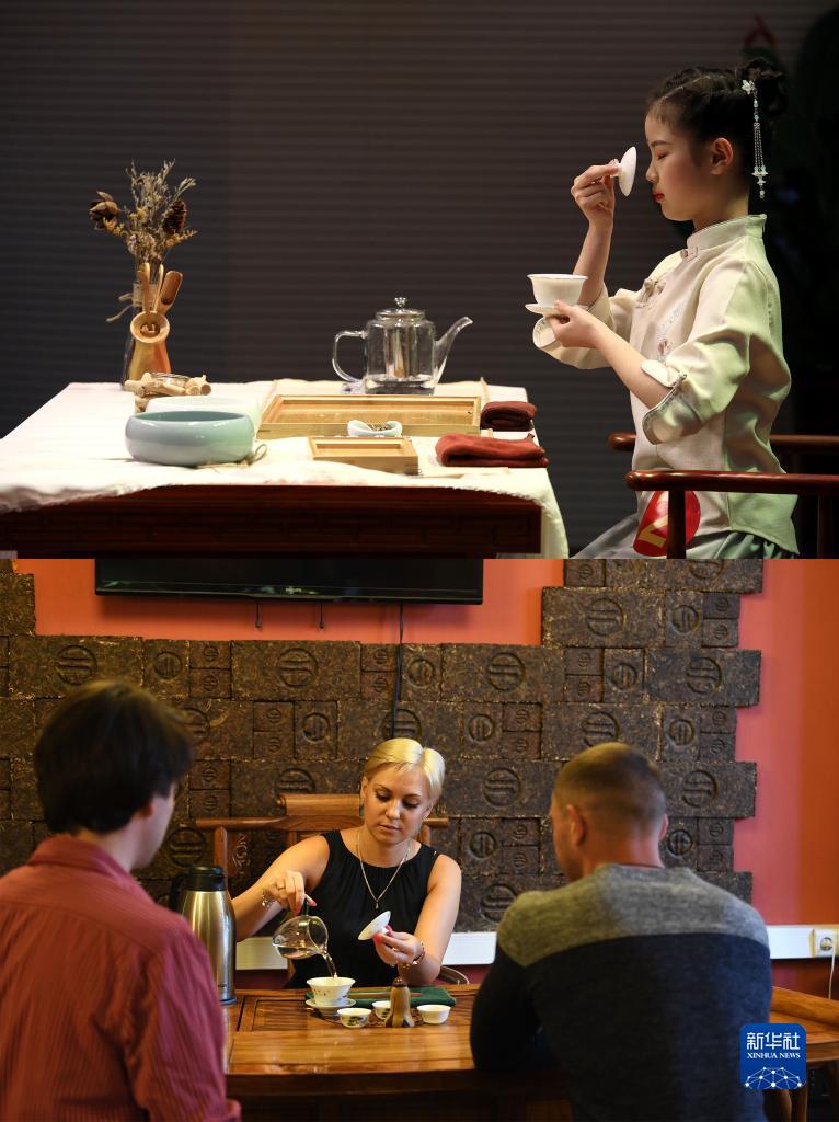 拼版照片:上图为2020年11月24日,石家庄市无极县实验初级中学学生王婉淇进行“闻香”展示(梁子栋摄);下图为2019年6月3日,在俄罗斯圣彼得堡的中国茶室,茶室合伙人奥利加在准备中国茶(新华社记者沙达提摄)。