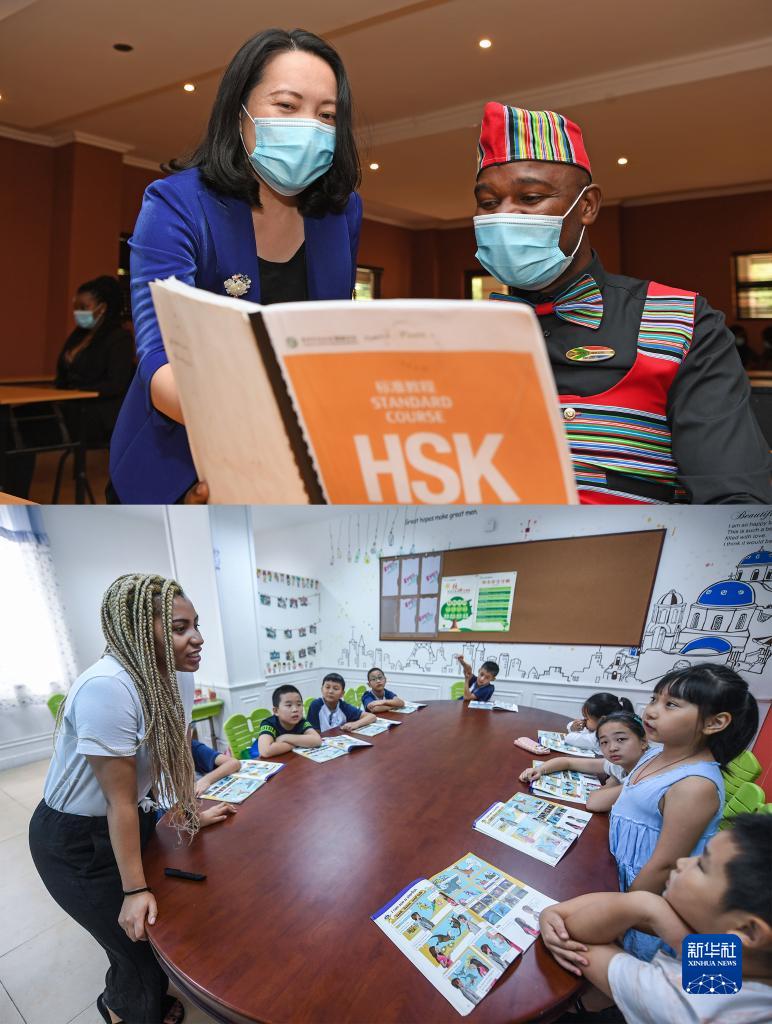 拼版照片:上图为2021年3月18日,在南非比勒陀利亚,约翰内斯堡大学孔子学院院长彭奕为参加中文培训课的学员答疑(新华社记者陈诚摄);下图为2017年8月4日,来自南非的教师宝莉在浙江长兴给孩子们上英语课(新华社记者徐昱摄)。