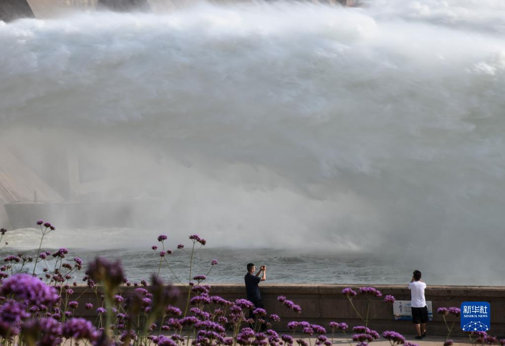 6月19日,游客在黄河小浪底水利枢纽工程出水口观看调水调沙场景。