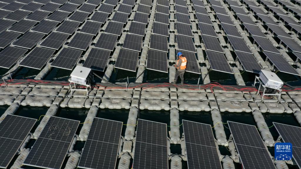 工人在国家能源集团宁夏电力公司宁东电厂3×5.98兆瓦漂浮分布式光伏发电项目现场施工(无人机照片,6月17日摄)。新华社记者 王鹏 摄