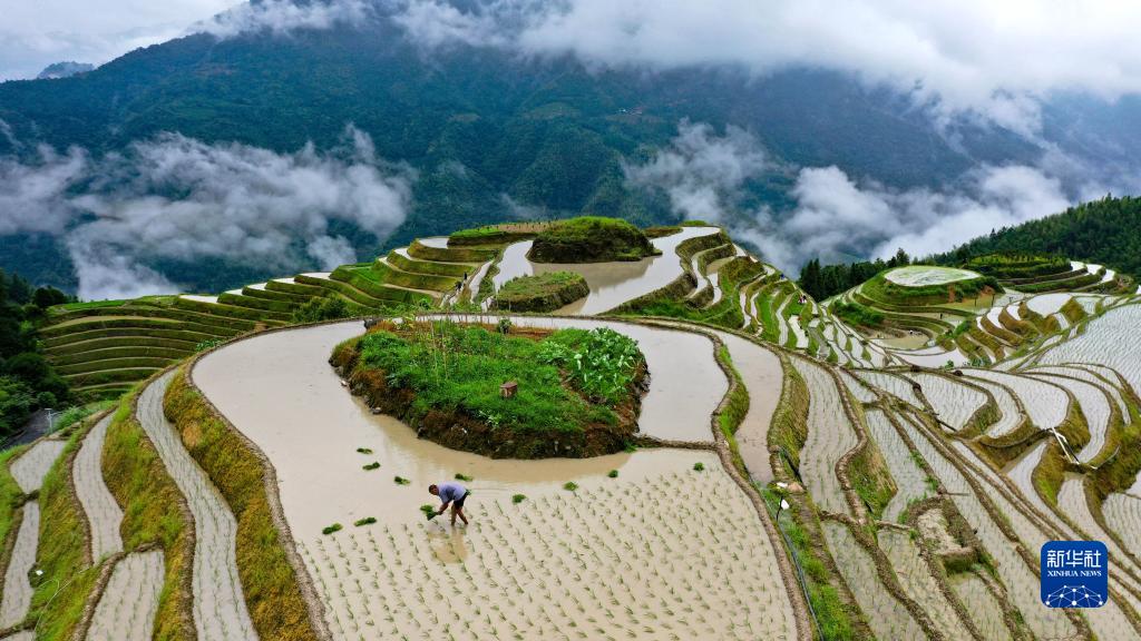 6月19日,在广西桂林市龙胜各族自治县龙脊镇平安村,村民在梯田上插秧(无人机拍摄)。
