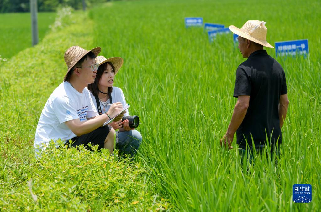 6月15日,李凯霖(左)和团队成员赵歆怡(中)在重庆梁平区的试验田里和负责日常管护的老乡交流。新华社记者 刘潺 摄