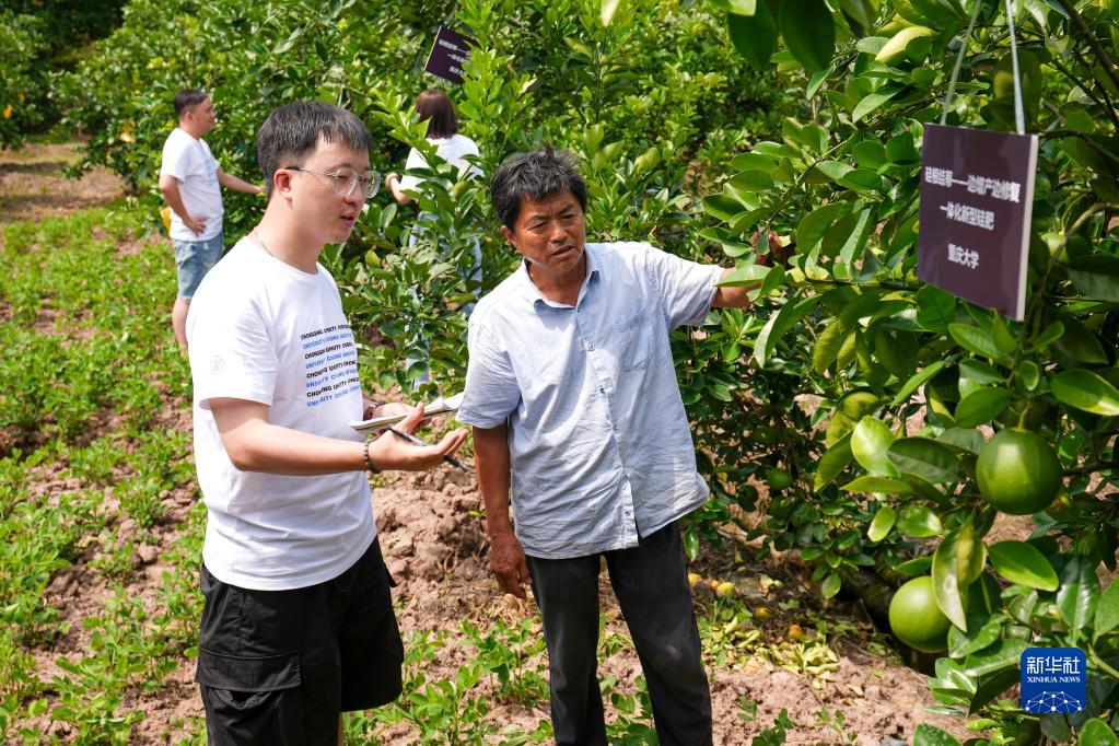 6月15日,李凯霖(前左)在重庆梁平区的梁平柚试验果园内,向果园的负责人了解使用新型硅肥后的变化。新华社记者 刘潺 摄