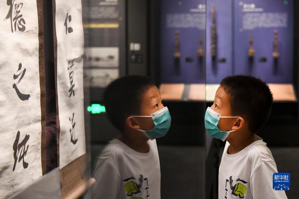 在新疆博物馆内,来自新疆教育学院实验小学二年级1班的孙景铄在参观展出的文物(6月16日摄)。