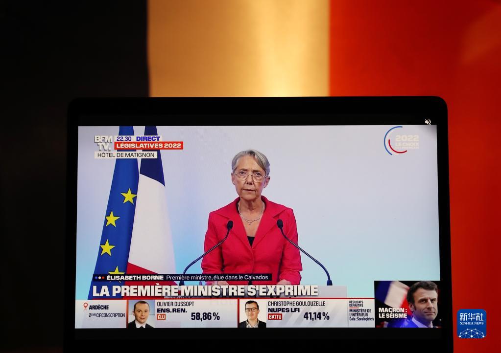 6月20日凌晨在法国巴黎拍摄的视频画面显示,法国总理伊丽莎白·博尔内在国民议会选举初步结果公布后在总理府召开新闻发布会。
