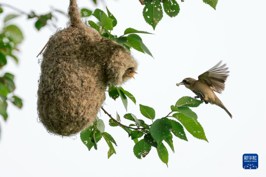 6月11日,在河北省唐山市丰南区黑沿子镇沿海湿地,一只中华攀雀幼鸟迎接捕食归来的成鸟。