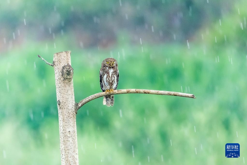 6月10日,在重庆市南川区清泉村,一只斑头鸺鹠冒雨伺机捕食。