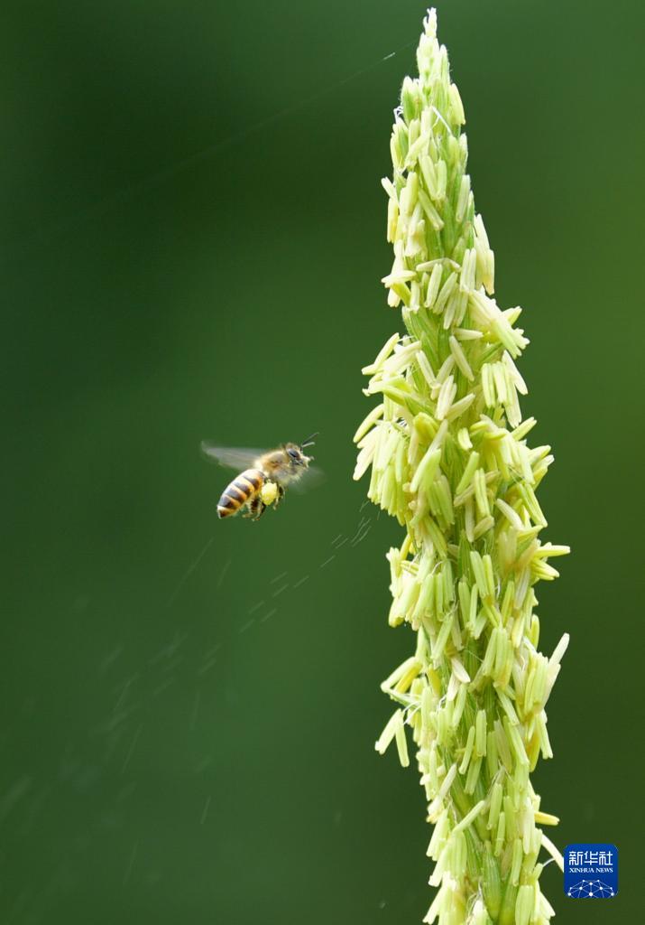 6月15日,在湖北省宣恩县珠山镇,蜜蜂在玉米植株旁飞舞授粉。