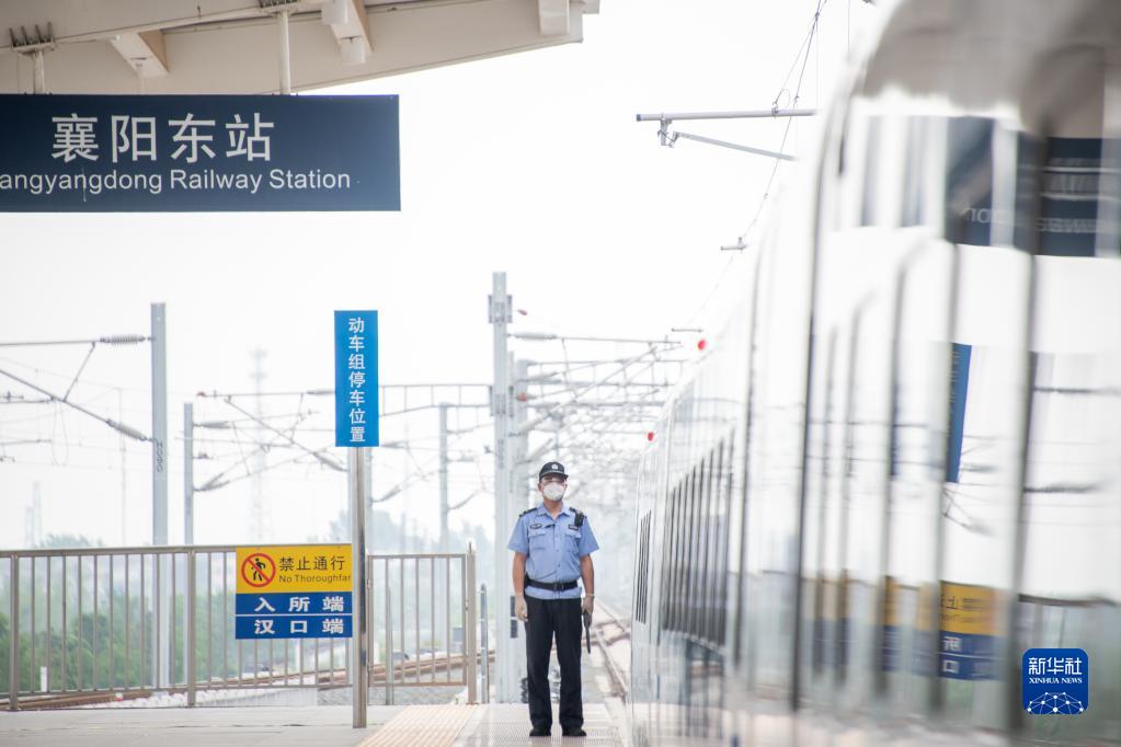 6月20日,襄阳东站铁路公安在郑渝高铁列车旁巡逻。
