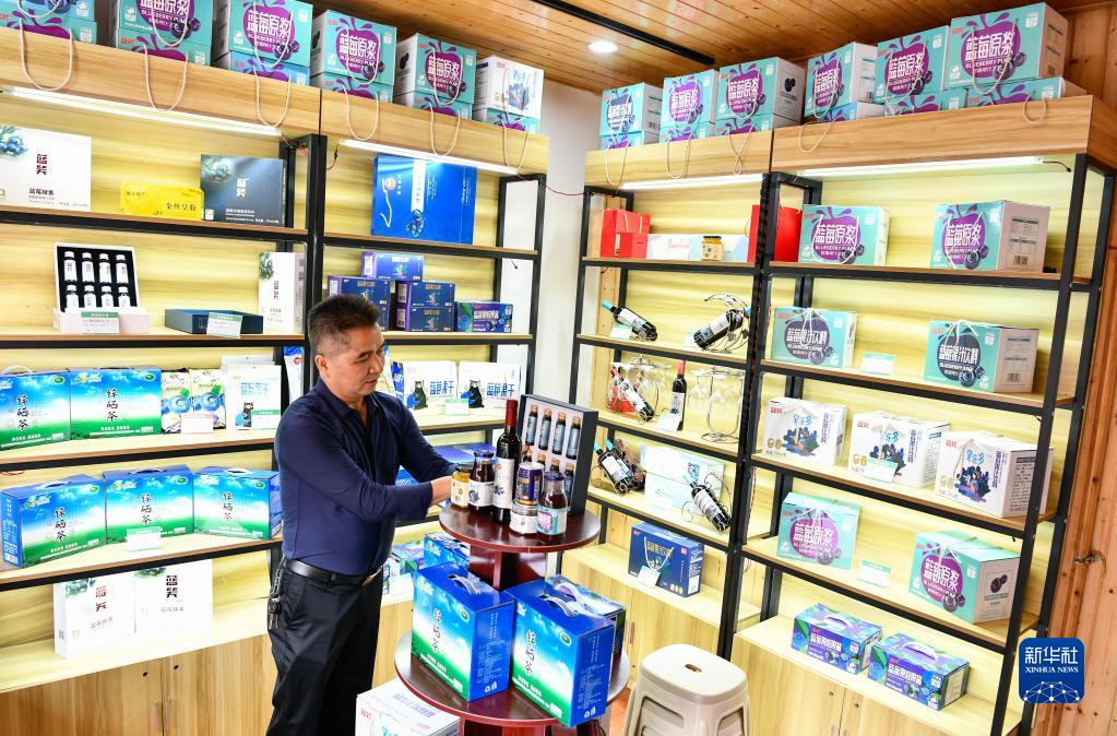 在贵州省凯里市下司镇一家蓝莓销售点,工作人员在整理蓝莓产品(6月19日摄)。