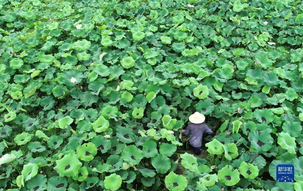 6月21日,湖南省怀化市通道侗族自治县双江镇罗武村,村民在荷田间施有机肥(无人机照片)。