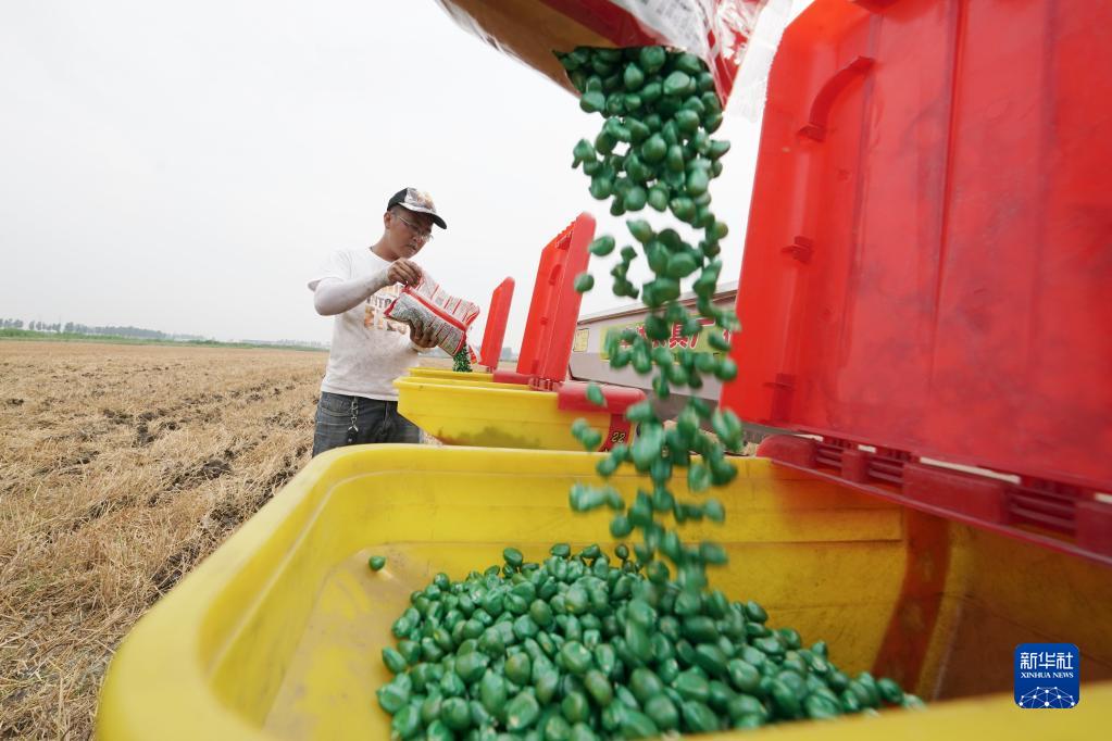 6月21日,在河北芦台经济开发区海北镇小韩村,农民往播种机中添加种子。