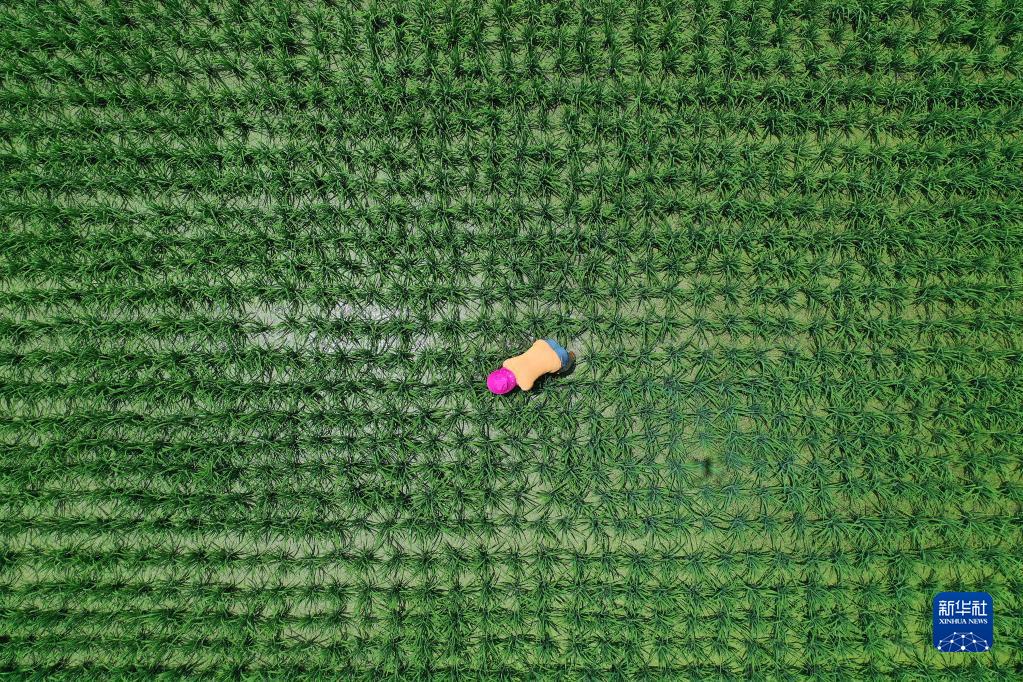 6月21日,重庆市黔江区马喇镇杉树村村民在稻田里薅秧(无人机照片)。