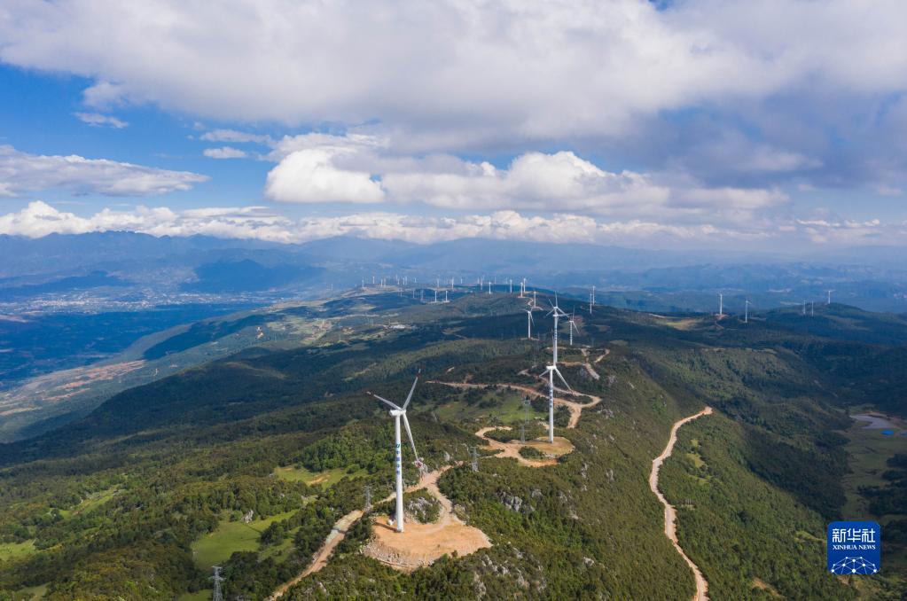 这是位于四川盐源县棉桠镇的四川盐源华电新能源有限公司的凉风坳风电场一角(6月20日摄,无人机照片)。