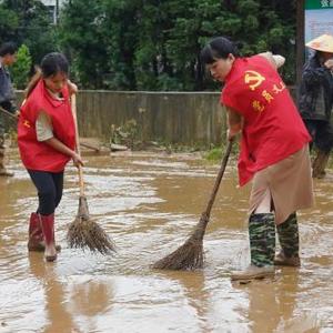 6月21日,在江西省德兴市泗洲镇张家畈社区,党员干部在清理淤泥和垃圾。