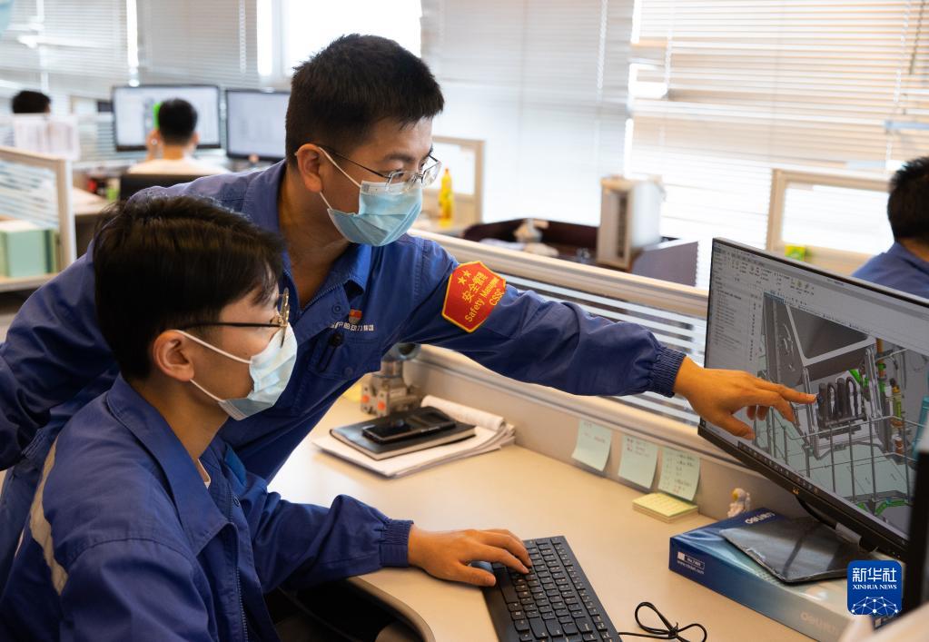 6月17日,在上海中船三井造船柴油机有限公司办公室,戴乙滔(后)和同事讨论一款发动机的内部设计。 新华社记者 金立旺 摄