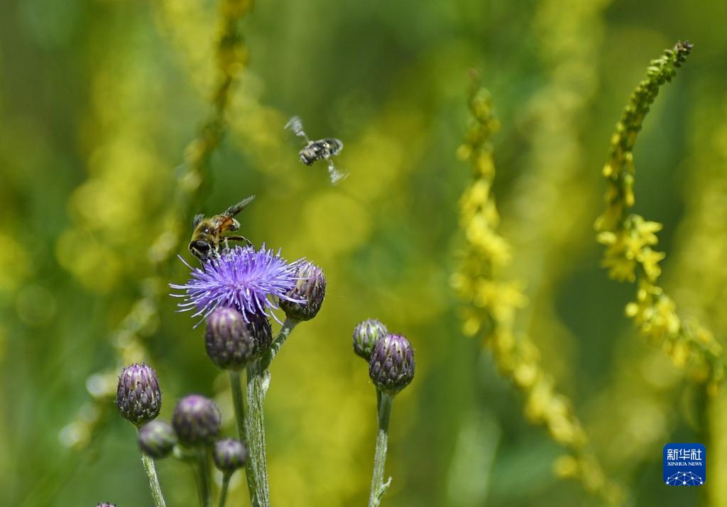蜜蜂在拉鲁湿地的花丛间(6月21日摄)。