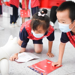 6月22日,学生们在长沙华夏实验学校和机器狗互动。