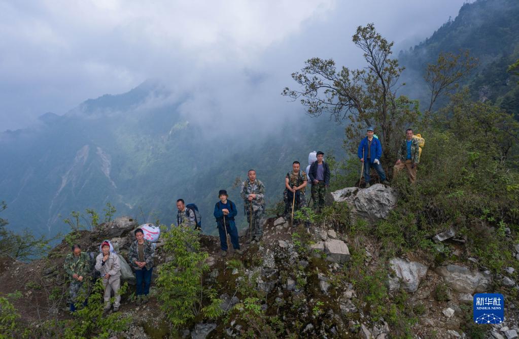 大熊猫国家公园彭州管护总站巡护员宋自强、胡先华、杨远则、周传军、杨远福、刘志波、杨成建、李德全、赖永祥、王朝清(从左至右)在巡山途中的合影(6月5日摄,无人机照片)。