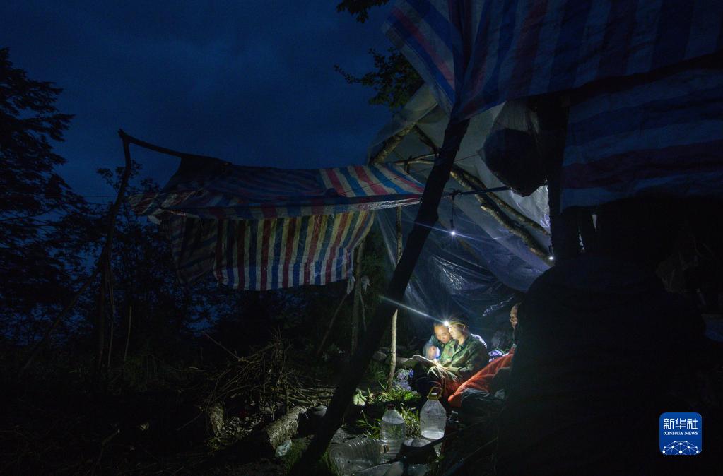 大熊猫国家公园彭州管护总站的巡护员宋自强(中)在宿营地和同事讨论巡护路线(6月4日摄)。