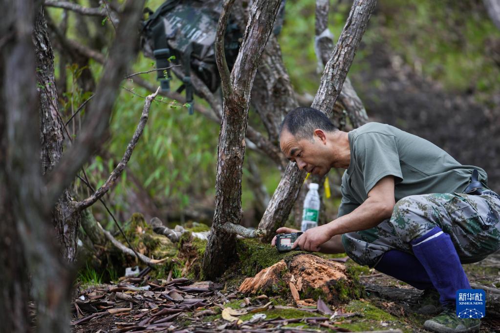 大熊猫国家公园彭州管护总站的巡护员宋自强在巡山途中用相机记录动物足迹(6月4日摄)。