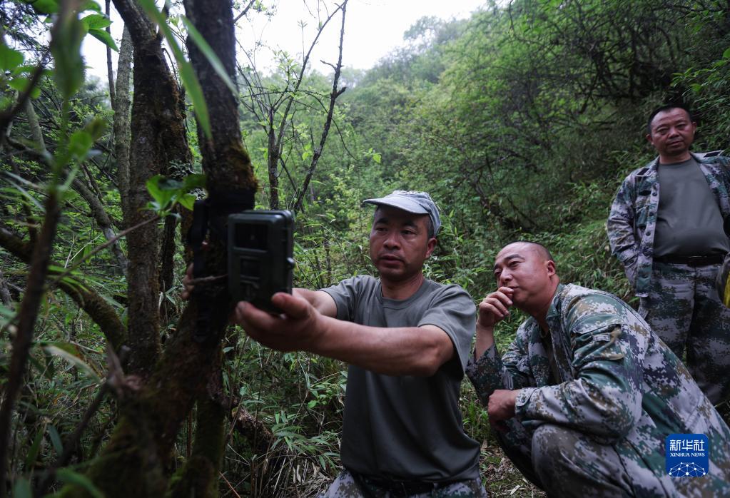 大熊猫国家公园彭州管护总站的巡护员宋自强(左)、刘志波(中)和周传军在对红外相机进行检查维护(6月5日摄)。