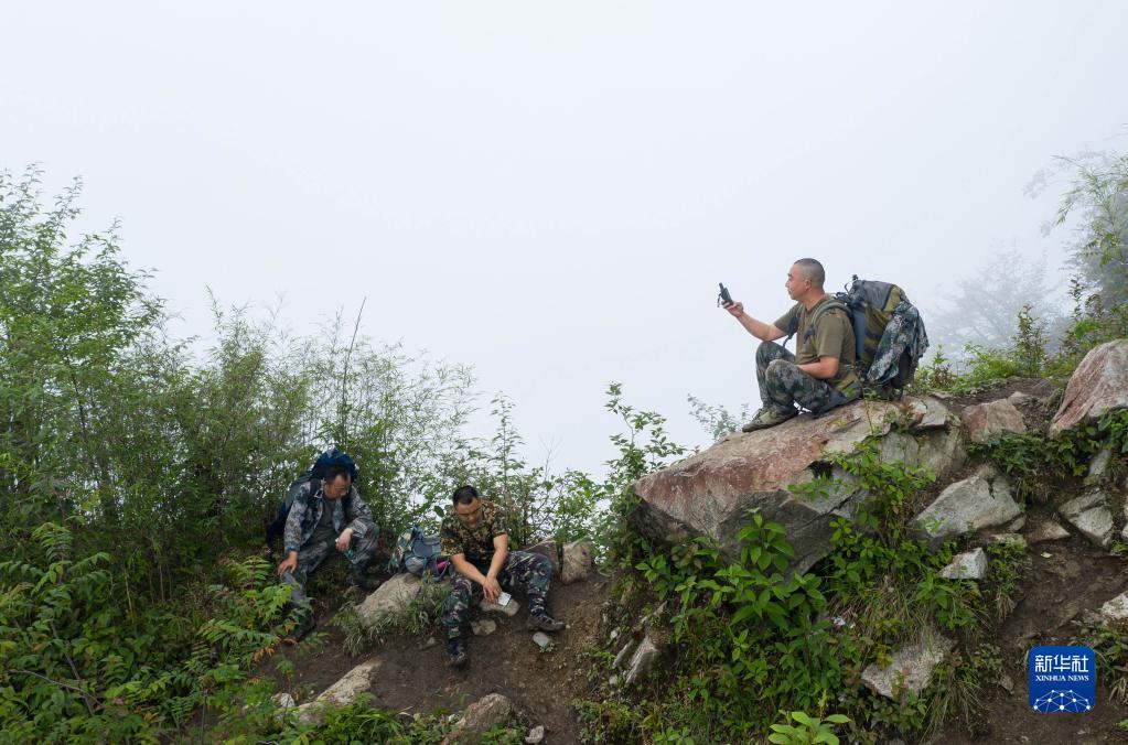 大熊猫国家公园彭州管护总站的巡护员刘志波(右)、杨成建(中)、周传军在巡山途中休息,刘志波在标注点位(6月4日摄)。