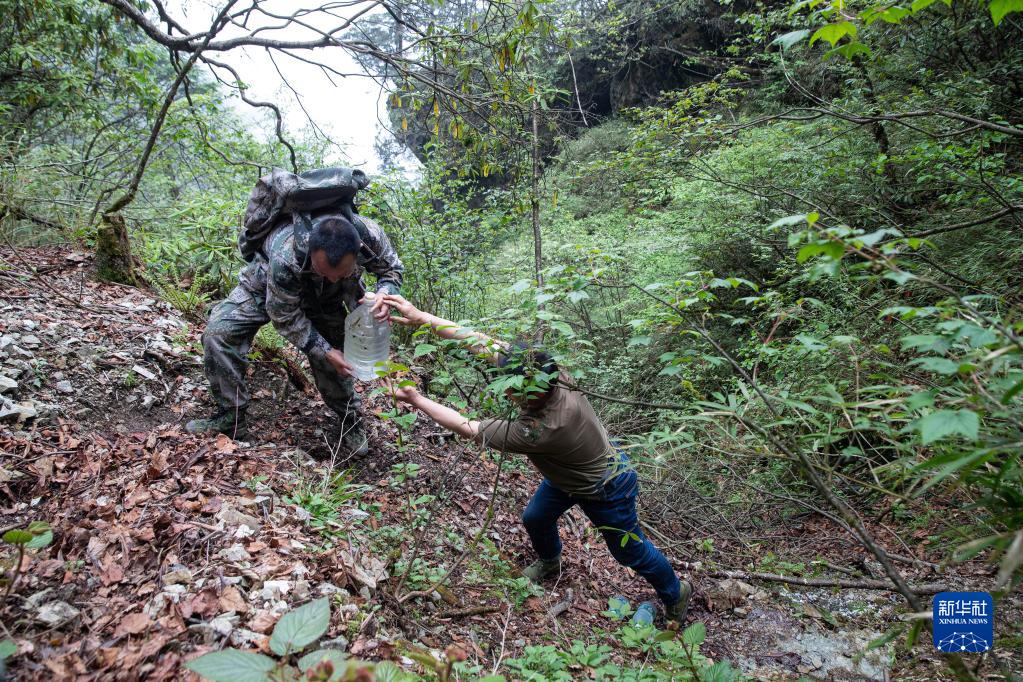 大熊猫国家公园彭州管护总站的巡护员在巡山途中收集山泉水用于饮用(6月4日摄)。